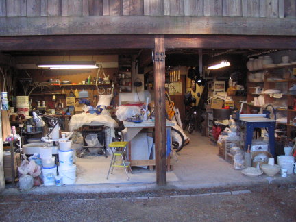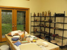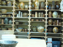 Ware shelves at the back of the studio provides lots of storage for completed pots.