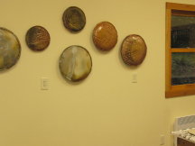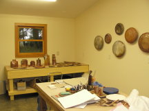 Sandy’s studio is set up as a hand-builder’s space. Wtih two large tables shelving and a slab roller. There is alos a fair amount of wall-space available for displaying her shields.